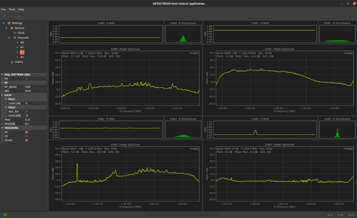 Thanks to its reconfigurable software and firmware, DETECTRION can be adapted into a four-channel receiver up to Ka-band frequencies. Thanks to this flexibility, DETECTRION can extend its use beyond GNSS, for example, to mobile network interference detection monitor multiple frequency bands in parallel. DETECTRION thus proves to be a compact, high-performance spectrum analyzer suitable for diverse environments.